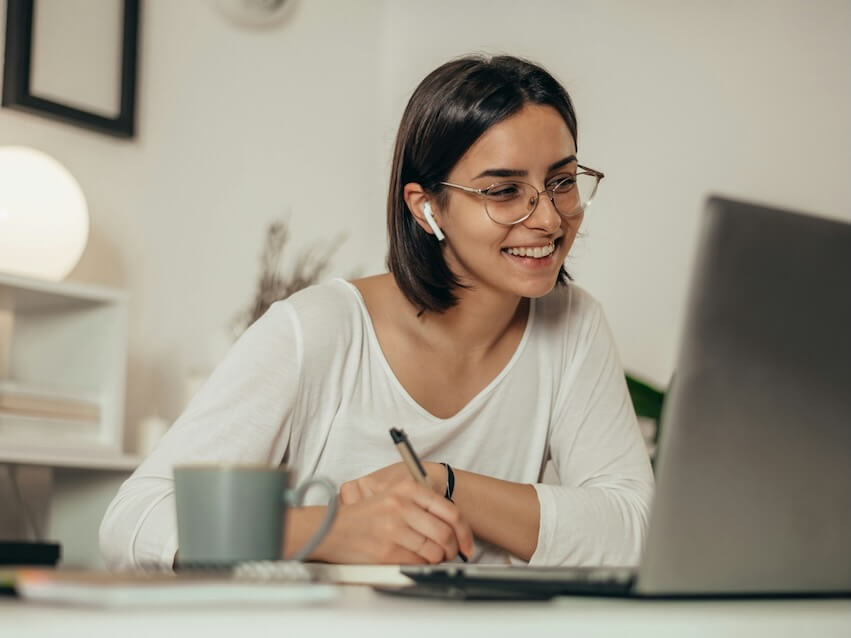 beautiful woman writing in a notebook and using a laptop while managing her business and working remotely from home